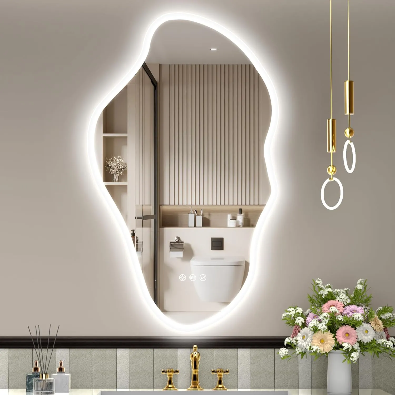 Le miroir de salle de bain asymétrique avec éclairage est conçu pour offrir un style moderne avec une forme irrégulière, permettant une installation horizontale ou verticale selon vos besoins. L'intensité lumineuse est réglable de 10 % à 100 % grâce à un interrupteur, avec des options de température de couleur : chaude (3000 K), neutre (4000 K) ou lumière du jour (6500 K). Le miroir est doté de haut-parleurs Bluetooth intégrés pour diffuser de la musique. Il comprend également un système de désembuage rapide et une protection IP44 pour une utilisation dans les environnements humides. Fabriqué en verre trempé, il offre sécurité et résistance aux chocs.