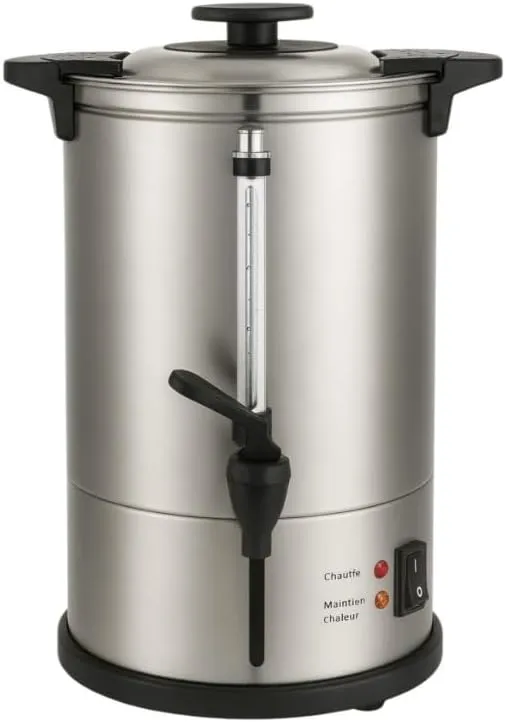 Capacité large : permet de préparer jusqu'à 10 litres de café, soit environ 65 tasses, adapté pour événements, hôtels, buffets et bureaux. Conception en inox : matériau résistant à la corrosion, durable et facile à entretenir. Température adaptée : extraction entre 90C et 92C pour un café bien préparé, toujours à bonne température. Performance efficace : puissance de 950 W, tension 220-240 V, chauffe rapide et uniforme. Utilisation simple : doté d'un robinet anti-goutte et d'un indicateur de niveau pour un service précis et propre. Sécurité : poignées isolantes pour une manipulation sûre, même lorsqu'il est chaud. Pratique : avec panier à café réutilisable pour doser facilement votre mouture.